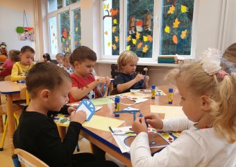 „Motylki” w kolorach jesieni Jesień to pora roku pełna kolorów i cudownych widoków. „Motylki” podczas ostatnich zajęć malowały farbami krajobrazy, liście, owoce, a także jesienne drzewa. Mali artyści stworzyli piękne witraże. Nasze prace zdobią korytarz przedszkolny, a każda z nich jest niepowtarzalna i jedyna w swoim rodzaju. Po owocnych zajęciach był też czas na zabawę.