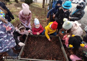 Witaj wiosno! Uczniowie z klasy 2a z zaciekawieniem oglądają roślinki, które wyrosły z posadzonych jesienią cebul. Witaj wiosno!
