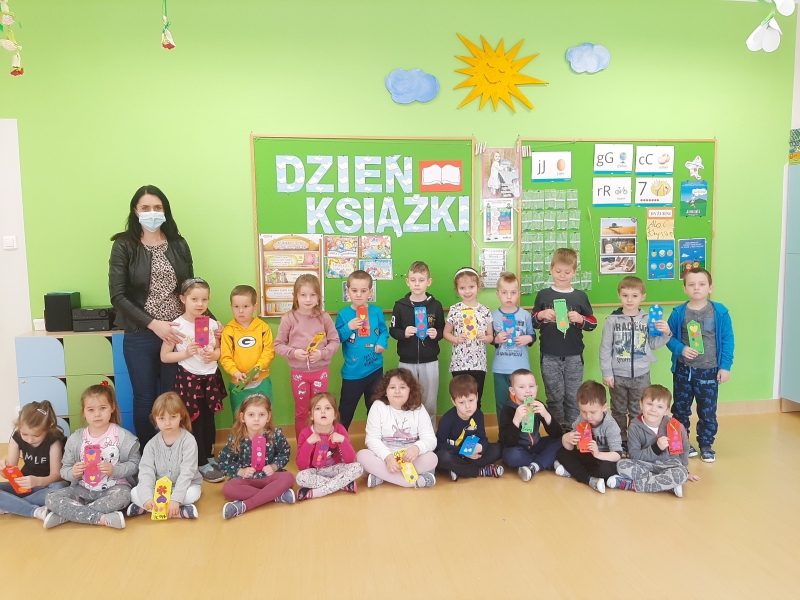Dnia 23 kwietnia dzieci z grupy kreciki obchodziły” Dzień Książki”. Tego dnia dzieci mogły zobaczyć ciekawe książki, które znajdują się w bibliotece tj.: encyklopedie, atlasy, słowniki, opowiadania, słowniki, baśnie, bajki itd. Pomogły również rozwiązać zagadkę „Pani Książce”, która napisała do nich list. Wykonały własną zakładkę do książki i umieściły ciekawe książki