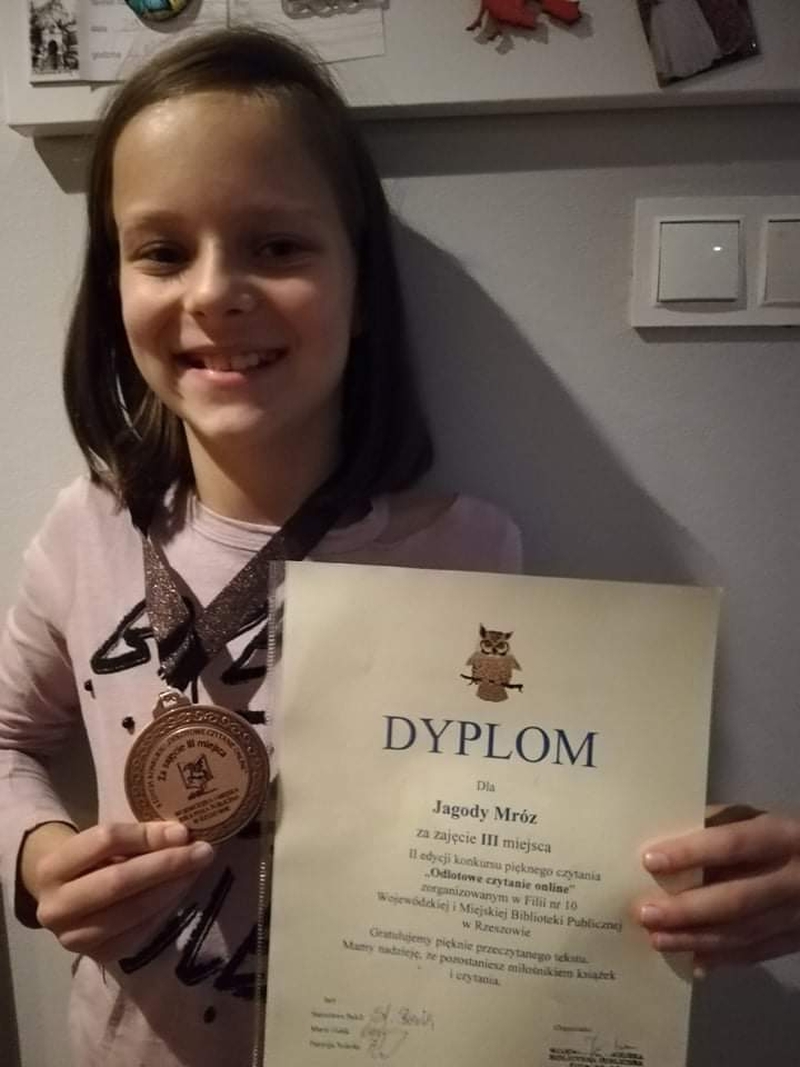 Jagoda Mróz, uczennica klasy 4a, jest wielką miłośniczką książek. Bardzo dobrze radzi sobie z głośnym czytaniem, dlatego też spróbowała swoich sił w II edycji konkursu pięknego czytania „Odlotowe czytanie online” zorganizowane przez Filię nr 10 WiMBP w Rzeszowie. W swojej kategorii wiekowej zajęła III miejsce.