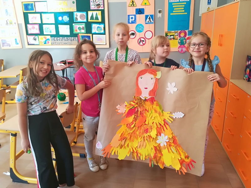 Klasa 2 a wyszła do szkolnego ogrodu w poszukiwaniu oznak jesieni. Uczniowie z zaangażowaniem tropili przyrodę. Zgodnie stwierdzono, że lato już odeszło. Wycieczka stała się inspiracją do wykonania wspólnej pracy plastycznej – Pani Jesieni.
