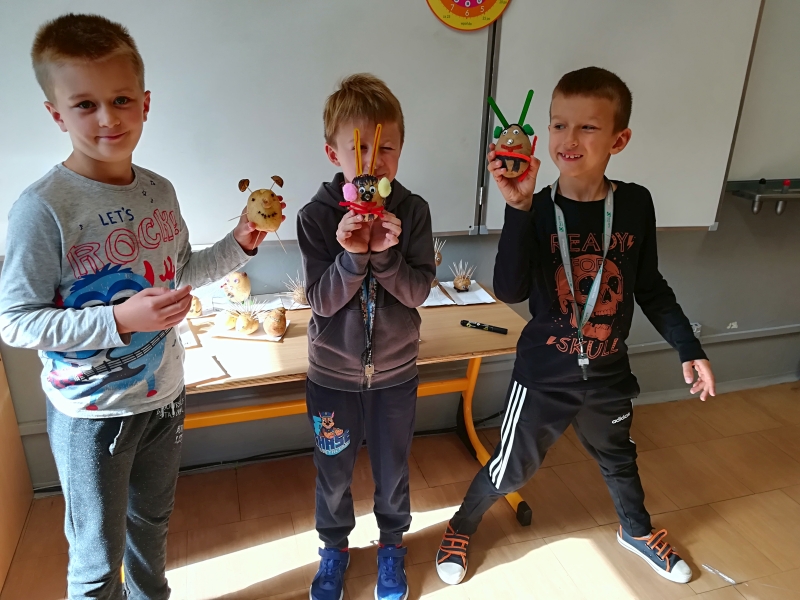 Jesień to pora roku, która dostarcza wielu pomysłów. Klasa 2a robiła ,,Cudaka z ziemniaka” , malowała jesienne krajobrazy, założyła kącik ,,Dary jesieni”, przygotowała przedstawienie wiersza J. Brzechwy ,,Na straganie” oraz poszerzyła znajomość języka angielskiego o nazwy warzyw, kolorów i pór roku.