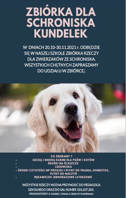 W DNIACH 20.10-30.11.2021 r. ODBĘDZIESIĘ W NASZEJ SZKOLE ZBIÓRKA RZECZY DLA ZWIERZAKÓW ZE SCHRONISKA.