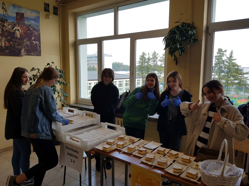 W dniach 12-13 października przeżywaliśmy w naszej szkole obchody XXI Dnia Papieskiego. Młodsi uczniowie klas 1-3 poprzez film edukacyjny i kolorowankę mogli poznać życie św. Jana Pawła. Starsi uczniowie rozważali cytaty z nauczania papieża. Szczególnym zaintersesowaniem jak co roku cieszyła się kremówka papieska. Dochód z jej sprzedaży został przeznaczony na Fundację Dzieło Nowego Tysiąclecia, która pomaga zdolnej młodzieży pochodzącej z biednych rodzin. Przez cały tydzień w szkole wiszą plakaty przypominające nauczanie św. Jana Pawła II. Serdecznie dziękujemy tym wszystkim, którzy włączyli się w przygotowanie i przebieg dnia papieskiego. Szczególne podziękowania należą się szkolnemu kołu Caritas, które prowadziłio sprzedaż kremówki oraz rozdawało cytaty z nauczania św. Jana Pawła II.