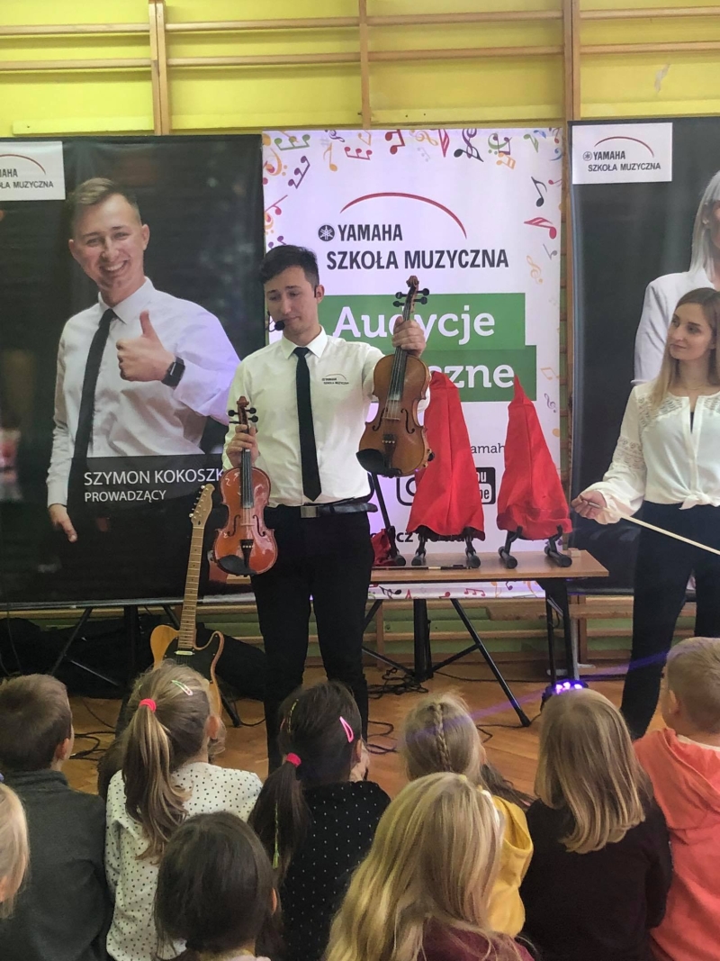 12 października ponownie zawitała do nas Szkoła Muzyczna Yamaha z kolejną lekcją umuzykalniającą. Tym razem muzycy opowiedzieli nam o skrzypcach. Prezentacja instrumentów zaczęła się od skrzypiec małych. Następnymi zaprezentowanymi instrumentami były: skrzypce duże, (które liczyły sobie ponad 100 lat, co jest rzadkością wśród skrzypiec), altówka oraz skrzypce elektryczne. Uczniowie dowiedzieli się skąd bierze się włosie do smyczka i jak się go nabija. Poznali też różne style gry: legato, staccato oraz tremolo.