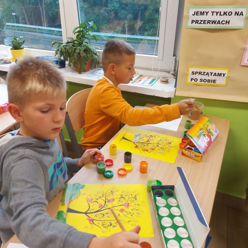Jesień to kolorowa pora roku. Zachęca do tworzenia pięknych prac plastycznych. Podczas czwartkowych zajęć plastycznych uczniowie wykonali piękne jesienne drzewa za pomocą farb plakatowych. Z radością odkrywali możliwości takiej formy plastycznego spojrzenia na przyrodę.