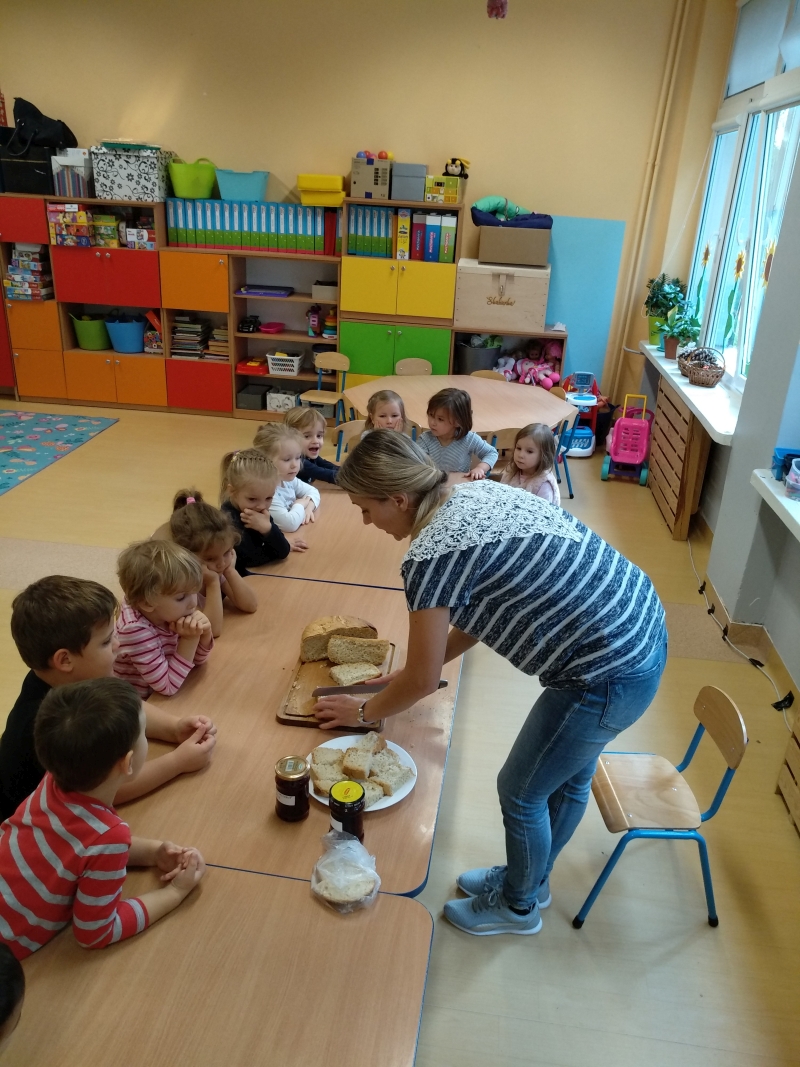 W dniu 15 października (piątek) przedszkolaki obchodziły Światowy Dzień Chleba. Na zajęciach dzieci miały okazję poznać proces powstawania chleba, rogalików, a także różnego rodzaju bułeczek. Dowiedziały się także jak powstaje mąka oraz na czym polega praca piekarza. Wykonywały różne ćwiczenia. Na zakończenie przedstawiłam im własnoręcznie upieczony chleb, który z apetytem kosztowały. Dzieci miały do wyboru dwa domowej roboty dżemy: malinowy i wiśniowy (oczywiście bez cukru). Degustacja przypadła do gustu nawet największym niejadkom.