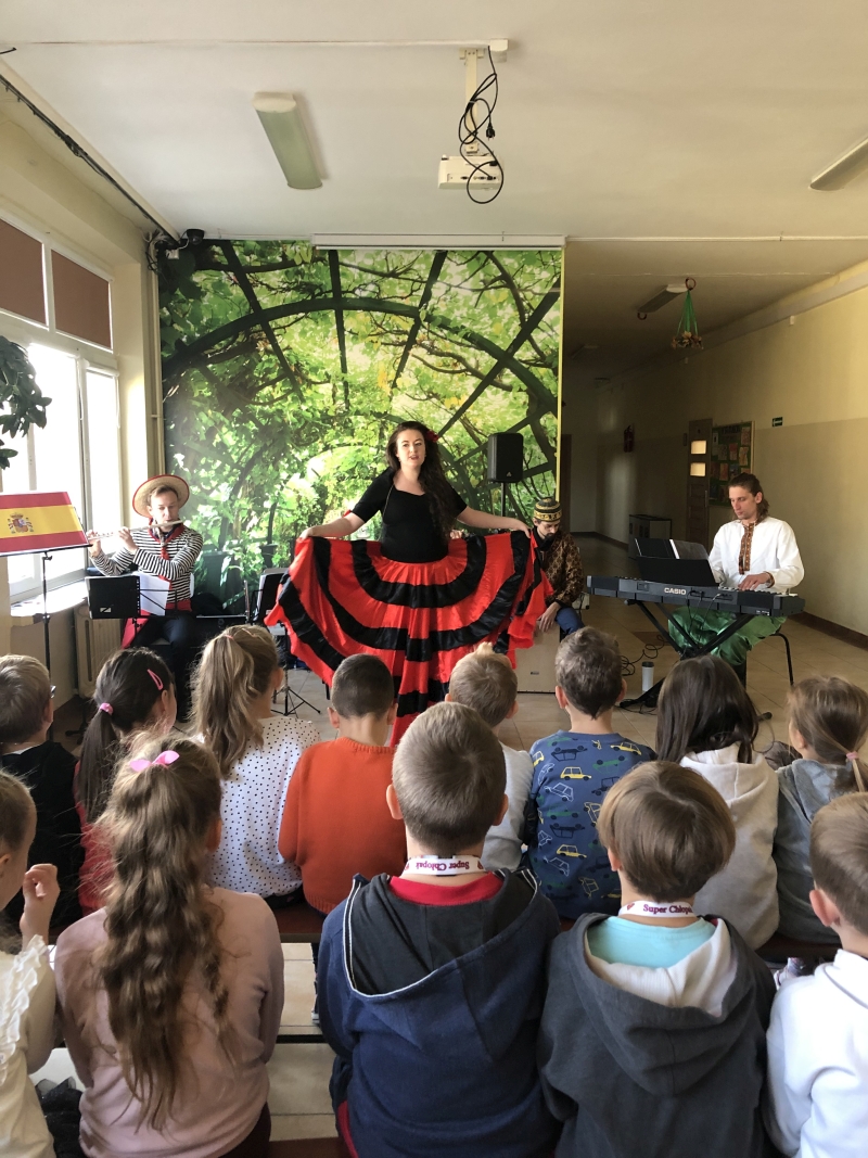 Po raz pierwszy w tym roku szkolnym gościliśmy Mobilną Filharmonię. Podczas koncertu pt. „Kolorowym szlakiem z muzycznym plecakiem” odwiedziliśmy, Włochy, Hiszpanię, Turcję, Szkocję, Ukrainę i Serbię. Podczas koncertu muzycy zagrali nam utwory charakterystyczne dla danego kraju. Poznaliśmy także ich tradycje i przepiękne, barwne stroje. To była pouczająca lekcja.