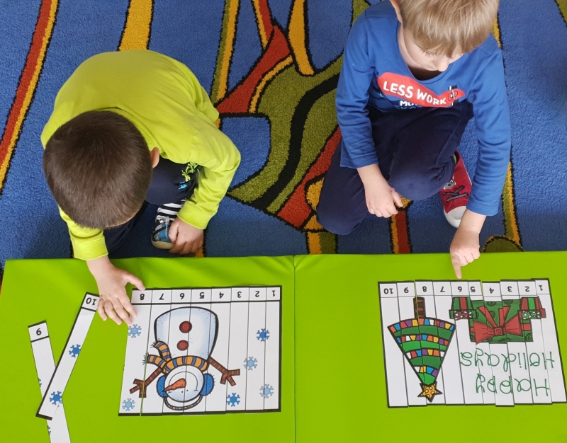 Podczas grudniowych zajęć z języka angielskiego przedszkolaki z grup „Mądrych Sówek”, „Wróbelków”, „Motylków” i „Krecików” poznawały słownictwo związane ze świętami Bożego Narodzenia. Dzieci układały „Christmas Puzzles” i przeliczały elementy świątecznej układanki. Grały w grę „Christmas Memory”. Świąteczne zajęcia nie mogły obejść się bez piosenki w języku angielskim o Świętym Mikołaju, który niedawno odwiedził nasze przedszkole. Wspólnie grając, bawiąc się i śpiewając szybko zapamiętujemy nowe angielskie słówka.