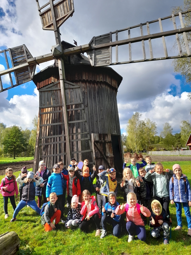 Uczniowie klas pierwszych pojechali na wycieczkę do Muzeum Kultury Ludowej w Kolbuszowej. Dzieci oglądały stare, drewniane zagrody, zabytkowy kościół, wiejską szkołę oraz młyn wodny, poznały również warunki życia na wsi w dawnych czasach. Wzięły udział w zajęciach warsztatowych pt. „W dawnej klasie – próba kaligrafii”. Dowiedziały się wiele o szkolnych przyborach do nauki, a także o kleksach i karach cielesnych. Siedząc w dawnych ławach, mogły poczuć się jak uczniowie sprzed stu lat i na własnej skórze przekonać się, jak to dawniej w szkole bywało. A pisanie rysikiem po tabliczce, w niczym nie przypomina obsługi tabletu…