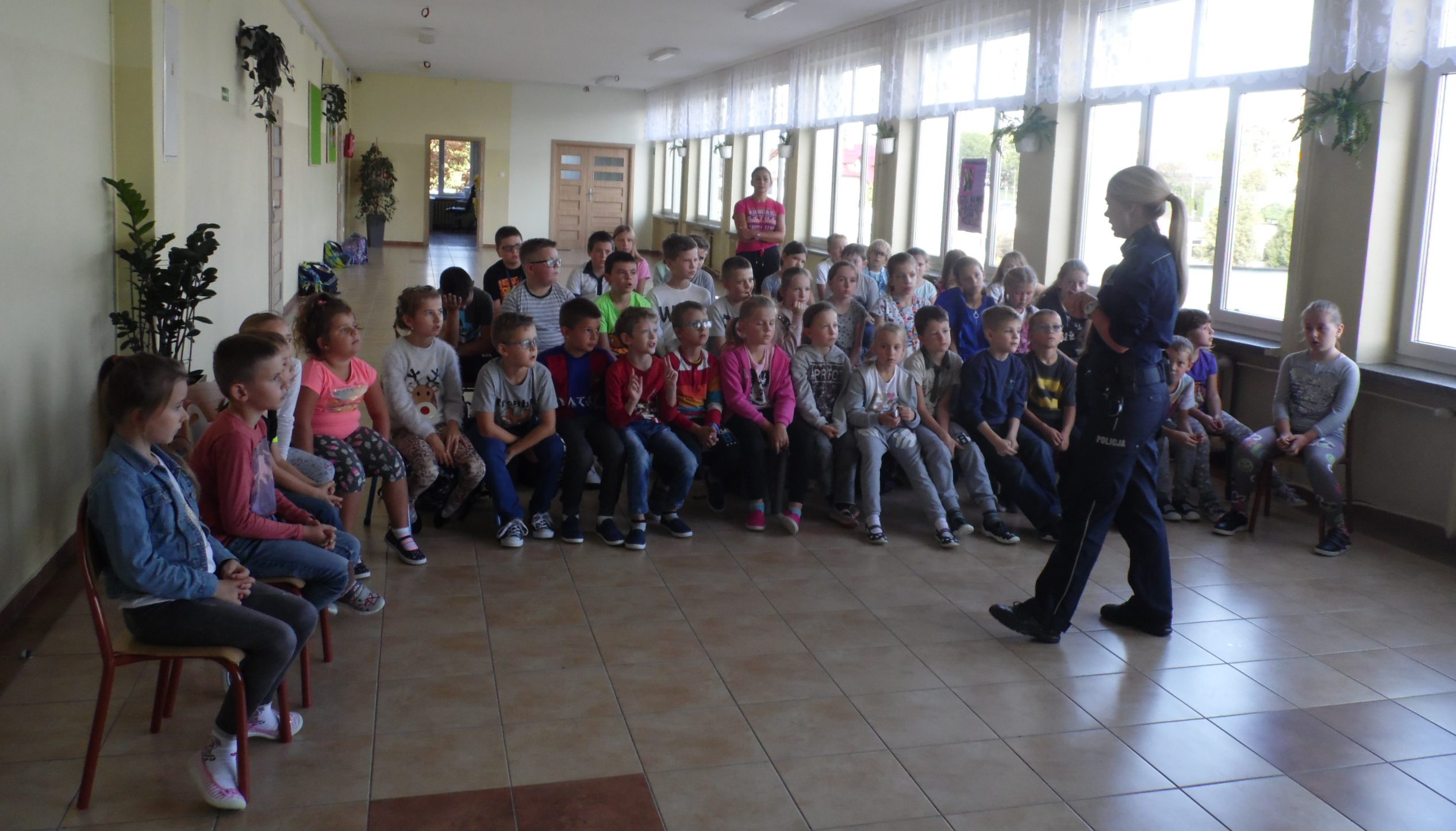 W naszej szkole duży nacisk kładziemy na edukację związaną z bezpieczeństwem dzieci. Dlatego, 13 września 2017 r. uczniowie klasy I i IV uczestniczyli w spotkaniu z policjantką.