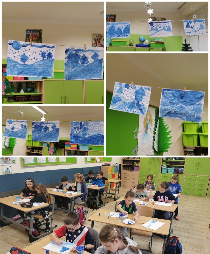 Mamy mróz! Przyszła zima! I choć oszczędzała nas do tej pory, za oknem nieprzerwanie śnieg. Z tej okazji uczniowie klasy 2C wykonali zimowy pejzaż – pracę plastyczną przy użyciu białej i niebieskiej farby.