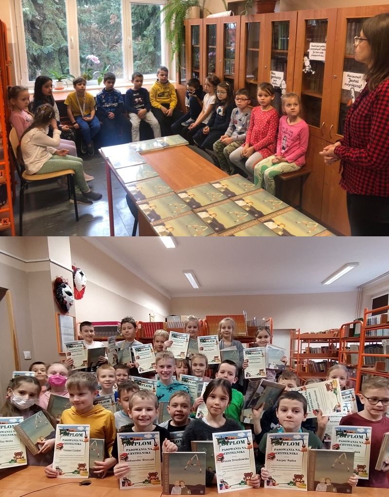 W dniu 8.02.2022 r. odbyło się uroczyste Pasowanie na Czytelnika uczniów klas pierwszych. Dla uczniów to kolejny ważny dzień, wszyscy stali się prawdziwymi czytelnikami naszej szkolnej biblioteki. Głównym celem uroczystości było zachęcenie najmłodszych uczniów do korzystania z biblioteki szkolnej, wypożyczania książek oraz nieustannego rozwijania umiejętności czytania. Uczniowie klas pierwszych doskonale poradzili sobie ze znajomością liter, umiejętnością czytania oraz znajomością regulaminu wypożyczania książek. Następnie złożyli uroczyste przyrzeczenie. Nasi nowi czytelnicy otrzymali książki oraz pamiątkowe dyplomy, które będą im przypominały o tym uroczystym wydarzeniu. Potem wszyscy zostali zaproszeni do częstego odwiedzania biblioteki i korzystania z jej zbiorów. Spotkanie przebiegło w miłej i przyjaznej atmosferze. Po takim wspólnym spotkaniu biblioteka będzie kojarzyła się najmłodszym czytelnikom z miejscem bezpiecznym, przyjaznym, radosnym, gdzie uczniowie są zawsze mile widziani. Warto wiedzieć, że do szkolnej biblioteki należy każdy uczeń naszej szkoły i nie trzeba się specjalnie zapisywać, czytelnikiem jest się od pierwszej do ósmej klasy. Zapraszamy wszystkich uczniów!