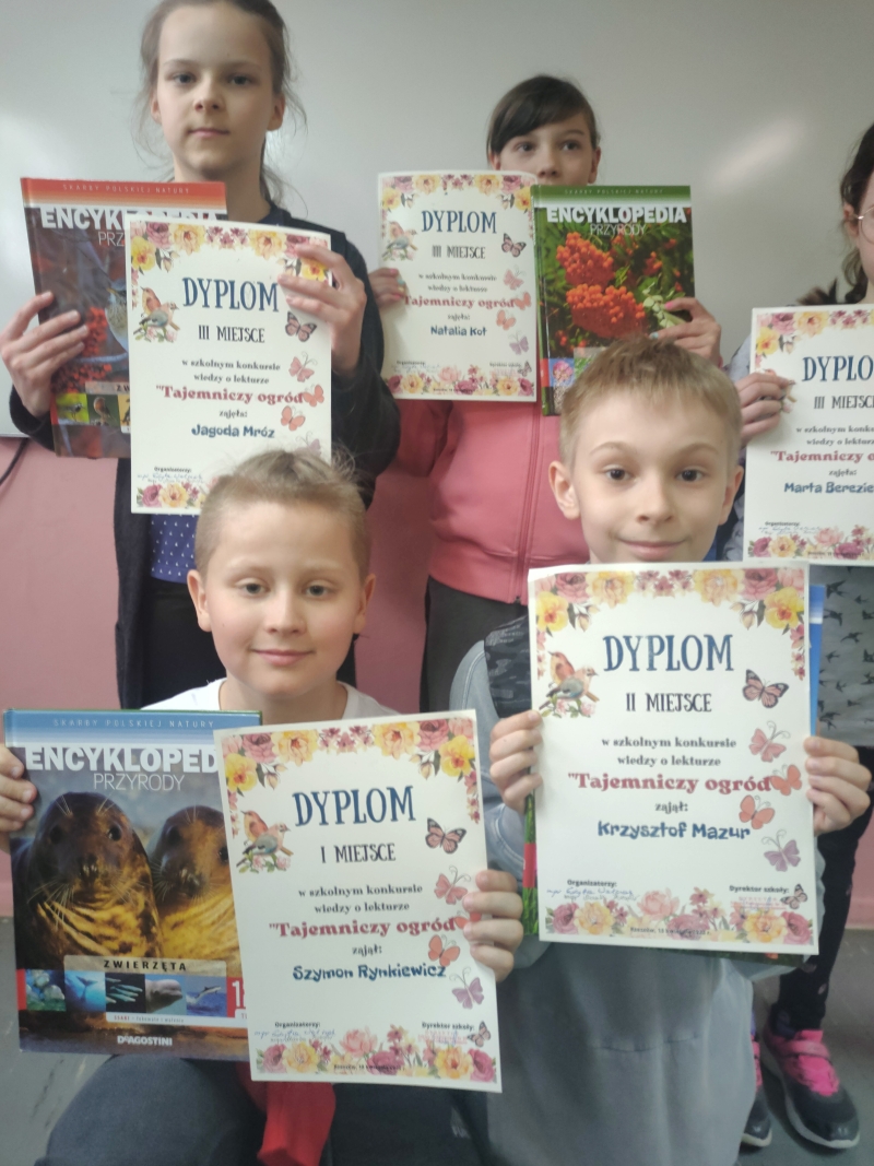 W kwietniu został przeprowadzony konkurs literacki, dotyczący treści lektury „Tajemniczy ogród”. Z zadaniami zmierzyło się dwudziestu uczniów. I miejsce zajął Szymon Rynkiewicz, uczeń klasy 4b, II – Krzysztof Mazur z klasy 4c, zaś miejsce III, z takim samym wynikiem: Jagoda Mróz z 4a, Natalia Kot oraz Marta Bereziewicz z 4b, Hanna Kalisz z klasy 4c. Zwycięzcom gratulujemy. Zachęcamy do kolejnej, majowej edycji, wszystkich uczniów klas czwartych i piątych. Tym razem zadania związane będą z książką pt. „Opowieści z Narnii”.