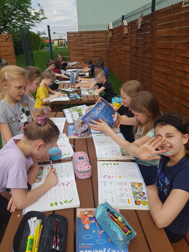 Pogoda dopisuje, więc uczniowie klasy 3c nie ograniczają swojej nauki w szkole tylko do klas wewnątrz budynku – dotleniają się również w naszej zielonej sali. Bezpośredni kontakt z przyrodą sprzyja rozmowom o drzewach i krzewach. Łatwiej też zapamiętać budowę kwiatu czy rozróżnić rośliny owadopylne od wiatropylnych.