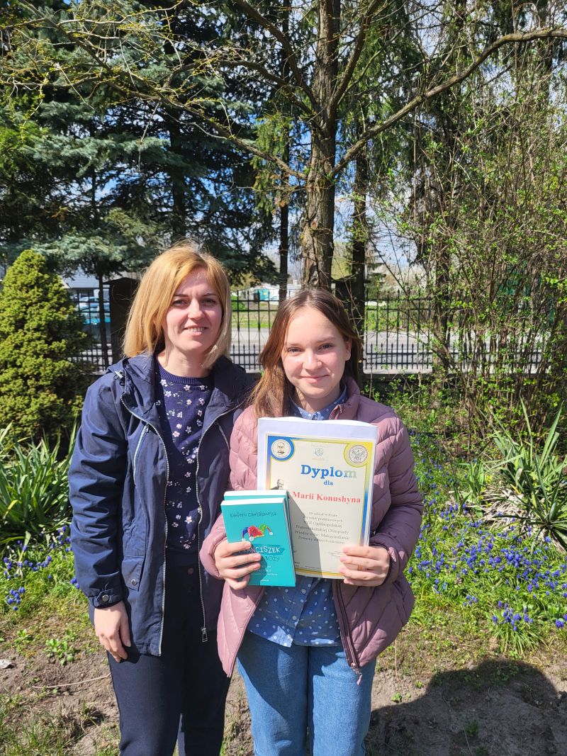 Dnia 20 kwietnia w Siedlcach uczennica naszej szkoły Masza Konushyna uczestniczyła w finale XVII Ogólnopolskiej Franciszkańskiej Olimpiady wiedzy o św. Maksymilianie Kolbe. Wcześniej przeszła etap szkolny i diecezjalny. W finale w którym uczestniczyli uczniowie z całej Polski Masza znalazła się w pierwszej dziesiątce najlepszych uczniów. Gratulujemy Maszy uczestnictwa w finale i osiągnięcia tak dobrego wyniku.