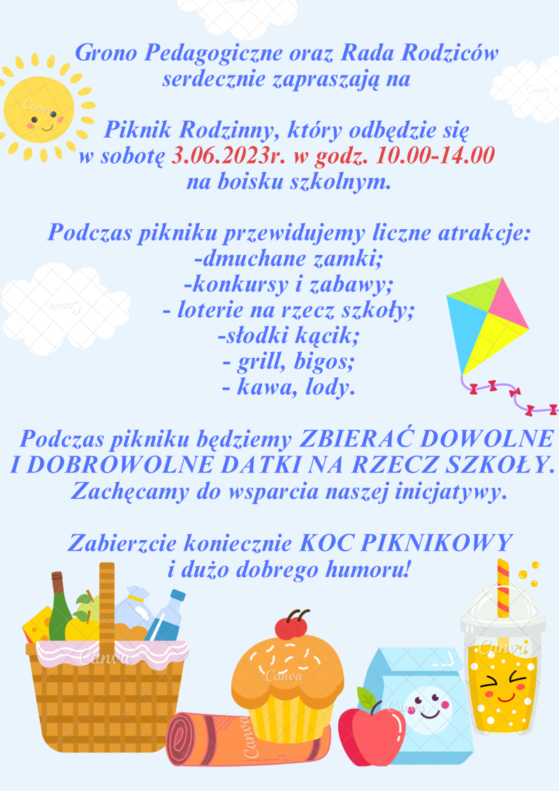 Rada Rodziców wraz z pracownikami Szkoły i Przedszkola rozpoczęła przygotowania do PIKNIKU RODZINNEGO, który planowany jest na sobotę 3.06.2023 r. w godz. 9.30 – 14.00 na terenie naszej szkoły.