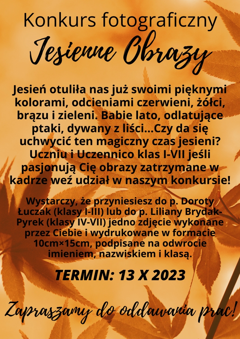 Jesień to szczególny czas w roku – robi się coraz zimniej, jednak widok złotych liści, zapach szarlotki i smak gorącej czekolady w chłodny wieczór rekompensuje nam kapryśną pogodę. Z tej okazji zapraszamy wszystkich pasjonatów fotografii z naszej szkoły do wzięcia udziału w Konkursie! Aby to zrobić wystarczy, że przyniesiesz jedno samodzielnie wykonane zdjęcie: