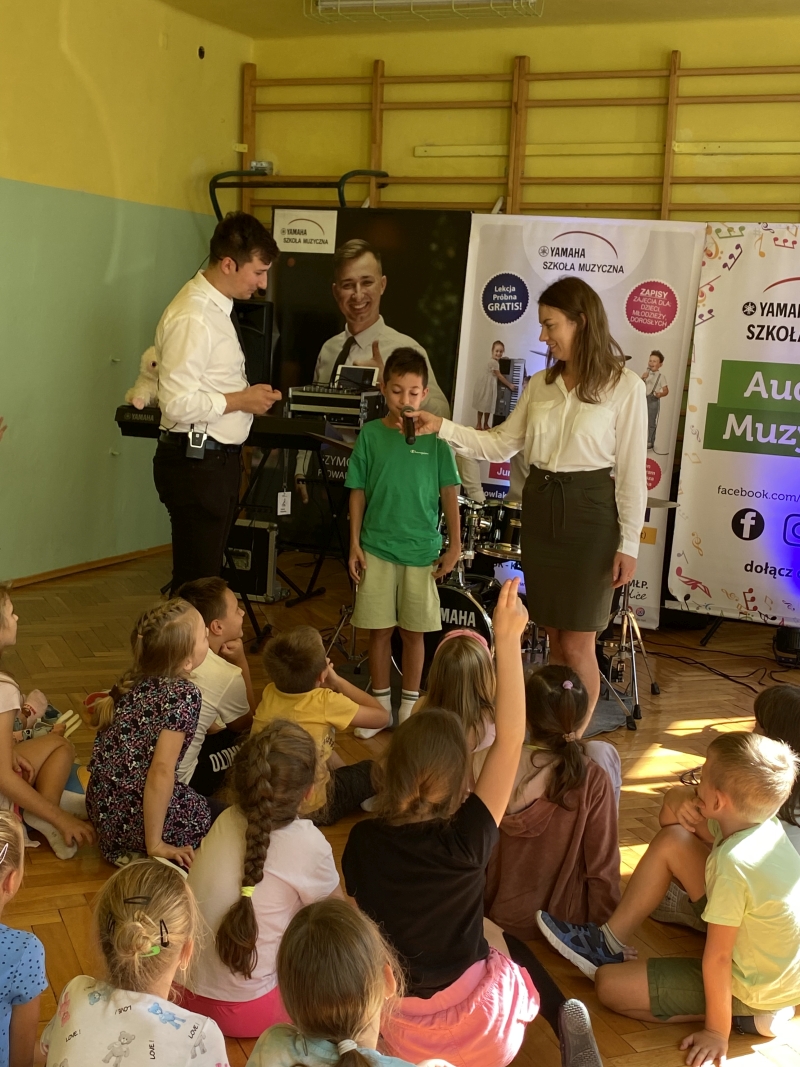 Uczniowie klas 1-3 uczestniczyli w audycji muzycznej prowadzonej przez Szkołę Muzyczną Yamaha. Na spotkaniu dzieci zapoznane zostały z instrumentami, na których można uczyć się gry w szkole muzycznej. Były to: gitara klasyczna i elektryczna, keyboard, perkusja. Ochotnicy mieli okazję zagrać na tych instrumentach. Lekcja muzyki wszystkim bardzo się podobała.