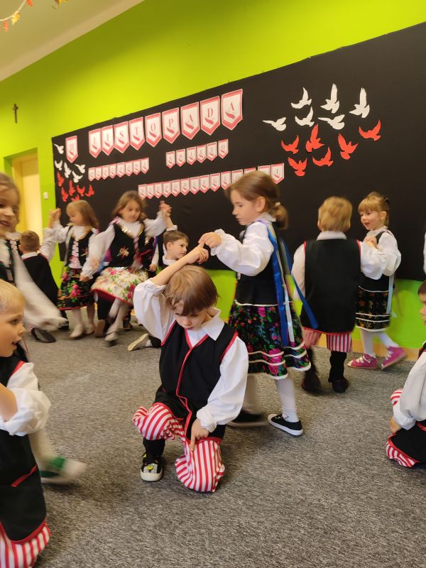 9 listopada w naszym przedszkolu obchodziliśmy Narodowe Święto Niepodległości. Z tej okazji zebraliśmy się, aby uroczyście świętować ten wyjątkowy dla Polaków czas. Wszyscy z powagą i w dużym skupieniu oglądali program artystyczny przygotowany przez dzieci z grupy „Kreciki”. Uroczystość miała na celu rozwijanie wśród wychowanków naszego przedszkola poczucia przynależności narodowej, pielęgnowanie polskiej kultury i tradycji, jednocześnie była pouczającą lekcją historii i patriotyzmu.