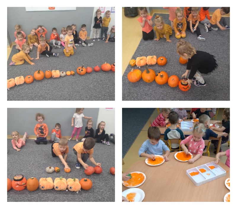 W tym dniu sale przedszkolne zamieniły się w dyniową krainę, w której królował kolor pomarańczowy. Na przedszkolaków czekały liczne gry i zabawy z udziałem dyni m.in.: slalom dyniowy, labirynt, turlanie dyni, układanie od najmniejszej do największej, zabawy muzyczno – ruchowe a także coś dla małych artystów, czyli praca plastyczna. Dziękujemy rodzicom za zaangażowanie i piękne dynie.