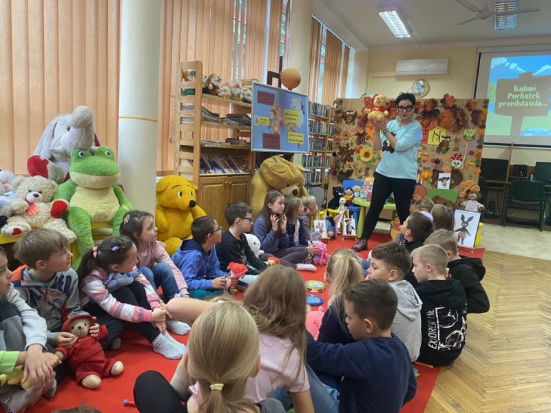 Uczniowie klasy 2c wraz ze swoimi pluszakami uczestniczyli w spotkaniu z Panią Renatą Dziepak z Muzeum Dobranocek w Rzeszowie, zorganizowanemu przez Wojewódzką i Miejską Bibliotekę Publiczną na ul. Podchorążych 1. Spotkanie było zatytułowane “Dobranocka w roli głównej: Kubuś Puchatek przedstawia”. W czasie spotkania dzieci poznały ekscytujące przygody bohaterów dawnych dobranocek tj. “Kubuś Puchatek”, ”Miś Uszatek”, których nie można już dzisiaj obejrzeć w telewizji. Zapoznały się z urządzeniem, które pomaga w tworzeniu animacji do bajek. Uczniowie bez problemu rozpoznali bohaterów dobranocek, które jeszcze do niedawna można było obejrzeć na ekranach TVP. Spotkanie wzbudziło ciekawość dzieci do bliższego poznania bohaterów dawnych dobranocek.