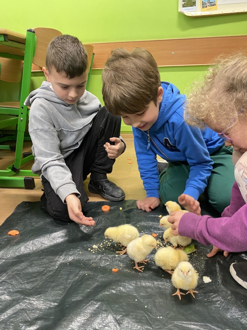 Uczniowie z pierwszych klas wzięli udział w mobilnych warsztatach wielkanocnych. Szukali jaj, odpowiadali na pytania i zagadki, obejrzeli kolekcję jaj, obserwowali inkubowane jaja. Najwięcej zachwytu wywołały zajęcia z kurczakami i królikami, które dzieci mogły karmić, głaskać i brać na ręce.
